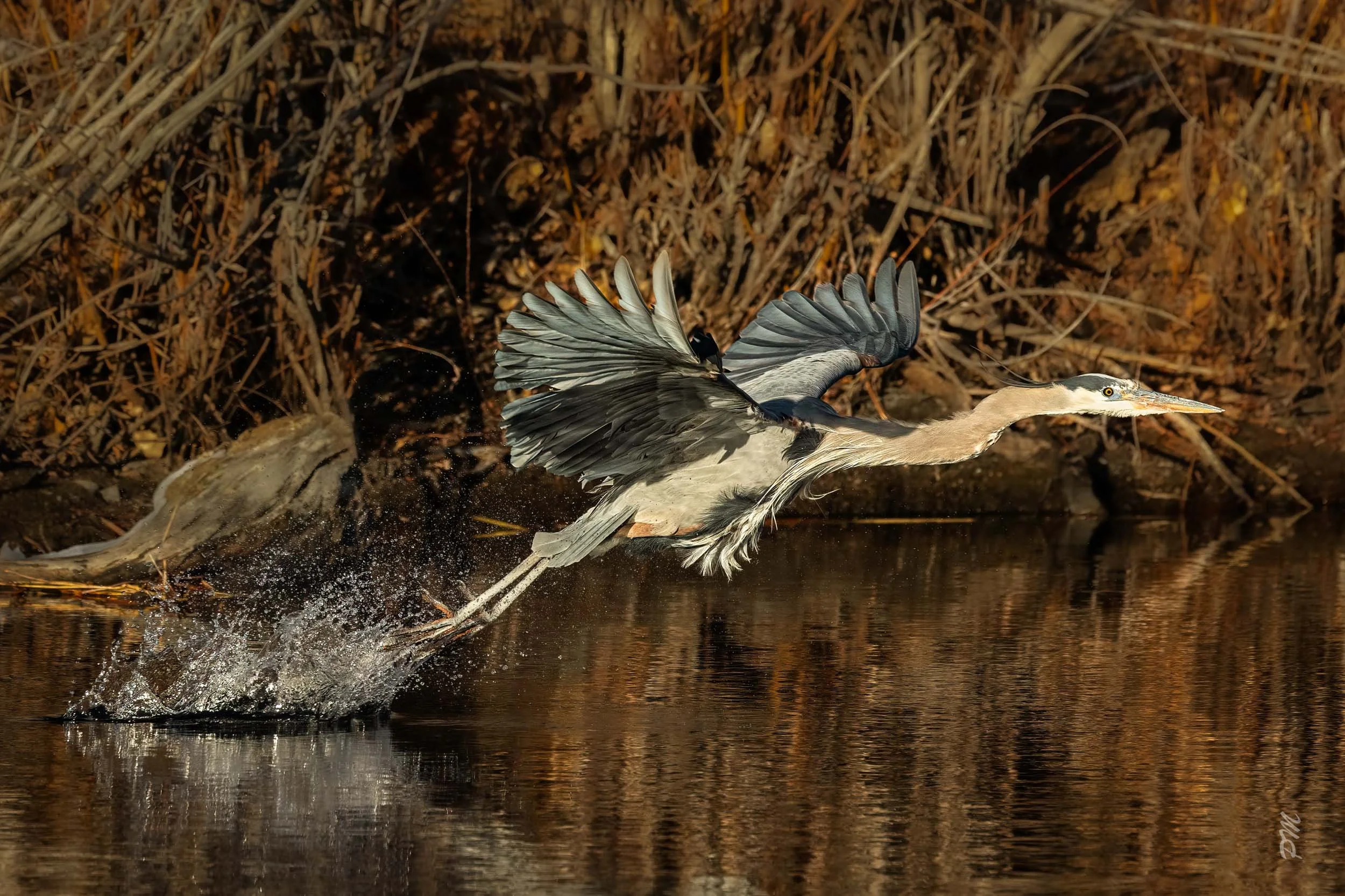Great Blue Heron flying over lagoon during golden hour in South Platte Park in Colorado